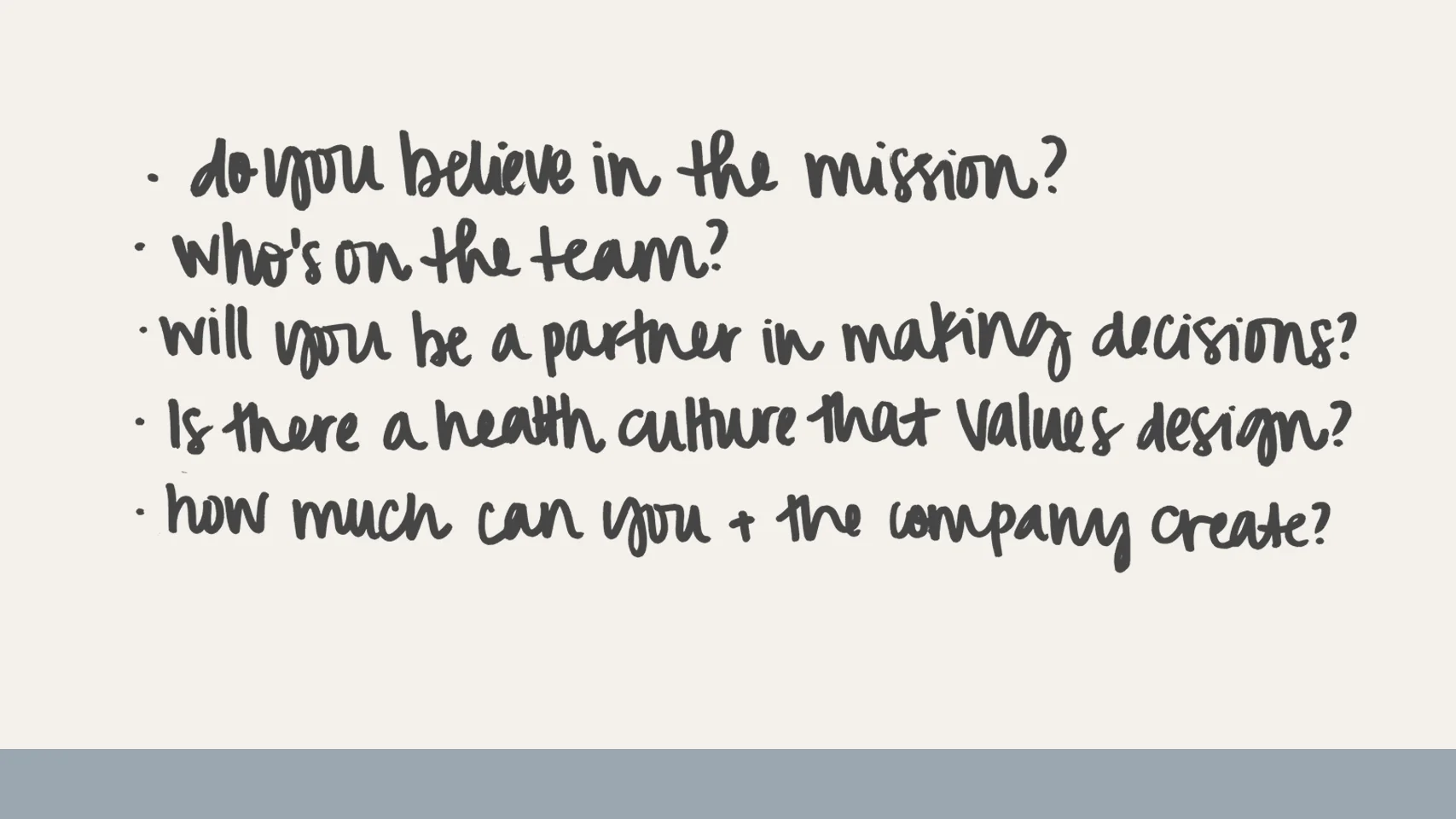 the space is designed. Has the company invested in creating an environment that fosters collaboration across disciplines? When you talk to anyone at the company are they finding meaning in their work and does their behavior actually reflect the company’s values?How much value can you and the company create? Are you going to be able to solve problems holistically or will you be pigeon holed into polishing off a feature? Is there a design need the company has that you can uniquely fill and if you succeed, will it move the needle for the business?